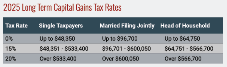 Tax rates on long-term capital gains and qualified dividends changed for 2025. You may qualify for a 0% capital gains tax rate for some or all of your long-term capital gains realized in 2025. In 2025, the 0% rate applies for individual taxpayers with taxable income up to $48,350 on single returns, $64,750 for head of household filers and $96,700 for joint returns. If this is the case, then the strategy is to figure out how much long-term capital gains you might be able to recognize to take advantage of this tax break.