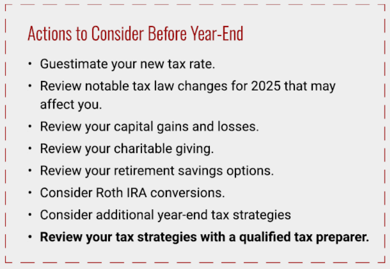 Since everyone’s situation is unique, it’s important for every taxpayer to start their year-end planning now! The appropriate strategies you use will depend on your income and other personal circumstances. As you go through this report, it may be helpful to note any strategies that seem relevant to your situation so you can discuss them with your tax preparer.